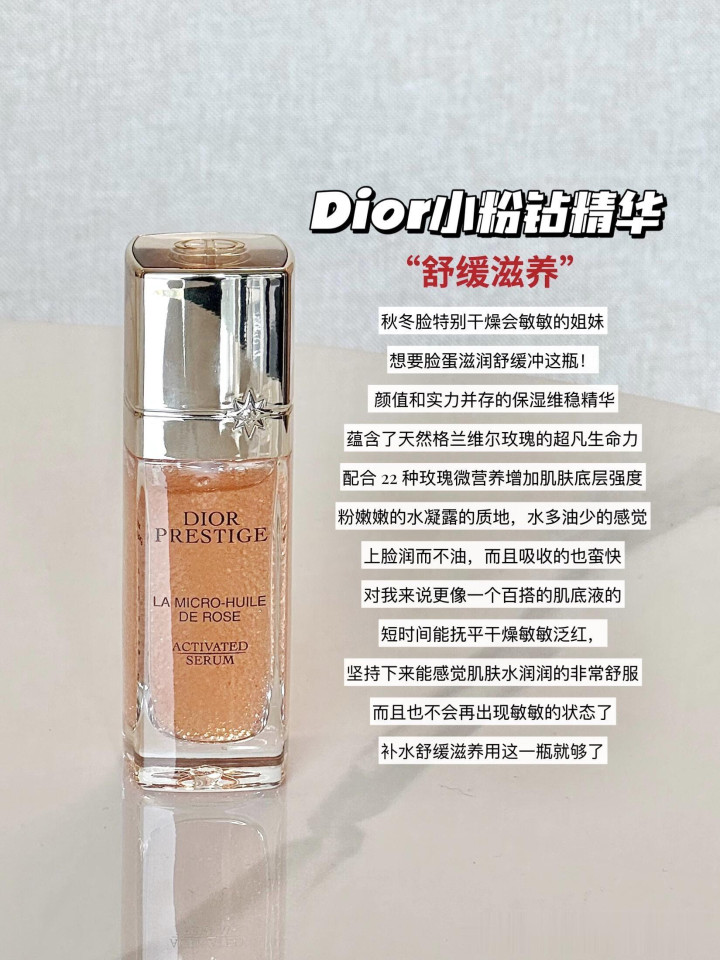 粉金包装,是妥妥的仙女精华吧,里面的满满的玫瑰珍萃和22种微营养,不仅能二倍速修护肌肤还能调节水油,脸蛋换季不稳定的时候,它能很好的安抚肌肤。